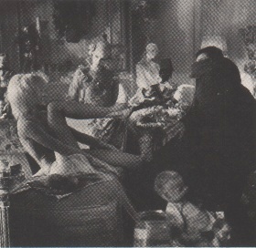 Top: A cautious Deckard enters Sebastian's apartment as Pris - under the veil - sits perfectly still, appearing to be just another mannequin. Left: Deckard gets too close in his examination and is sent flying across the room with one forceful kick from Pris. |